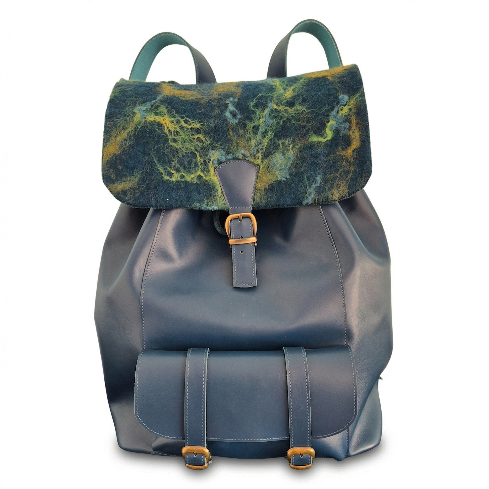 Een superhandig rugzakje van soepel leer met vetersluiting en klep. De voering heeft een zwart-wit print en is voorzien van een rits- en een insteekvak. Op het achterpand zit nog een vak met rits en aan de voorzijde een vakje wat sluit met drukkers. De draagbanden zijn verstelbaar.